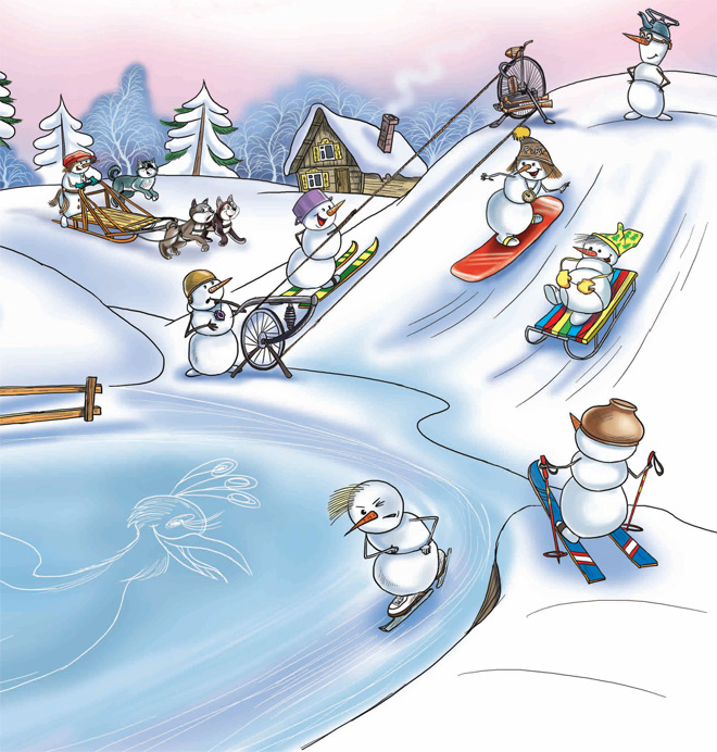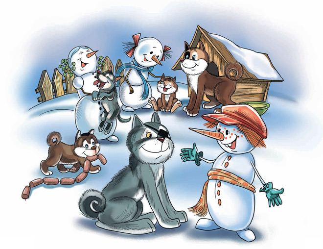 Снеговики обежали всю деревню: заглянули и на конюшню – проведать лошадей, и в собачий городок. Летом у лайки Фуфайки появились три щенка, и всем хотелось с ними поиграть…