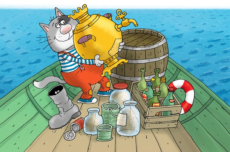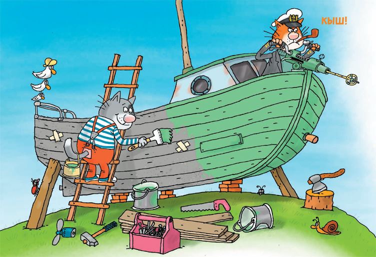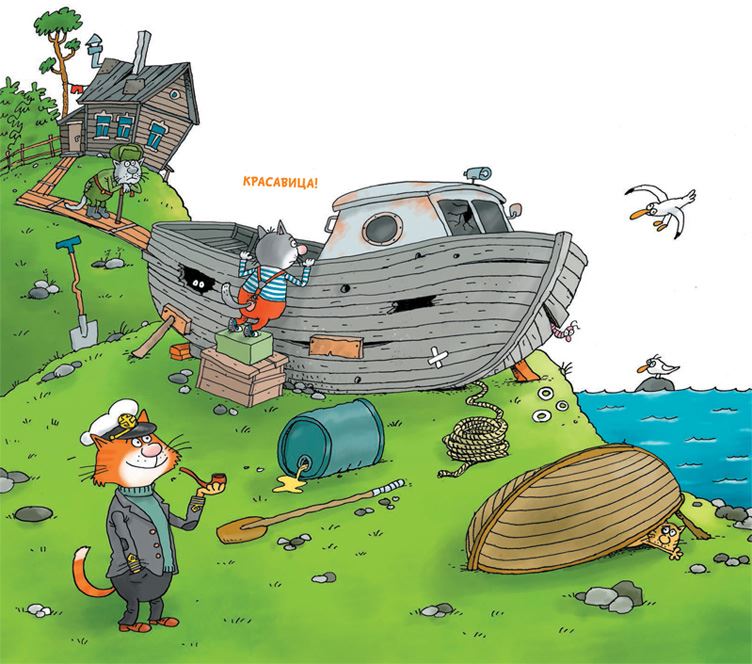 Целую неделю коты занимались подготовкой к плаванию. Лодку подремонтировали, просмолили и покрасили. Из лыжной палки Котаускас сделал гарпун. И установил на носу гарпунную пушку. Афоня тем временем чинил старые сети: