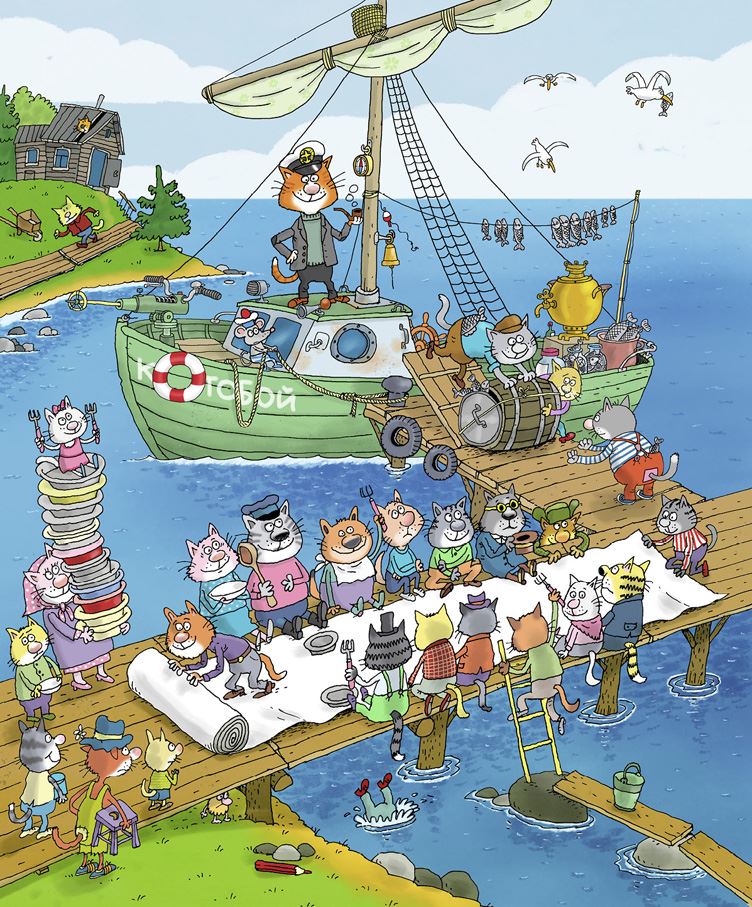 Заранее приготовленную скатерть разостлали прямо на причале. И пир начался. Коты ели так, что за ушами трещало.