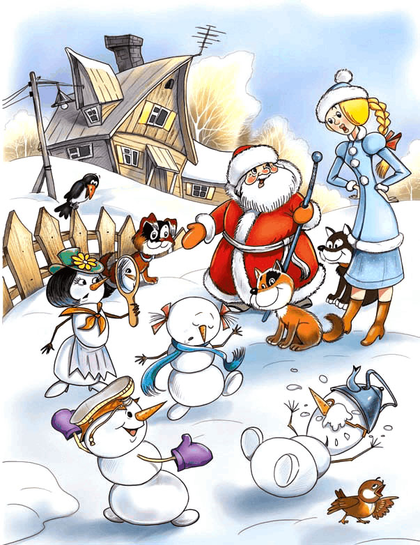 – Дорогие снеговики и снегови́чки! – начал Дед Мороз. – Поздравляю вас с началом учебы. Все уроки в нашей школе будет вести моя внучка Снегурочка. А я буду ей иногда помогать. Снегурочка, ты хочешь что-нибудь сказать?