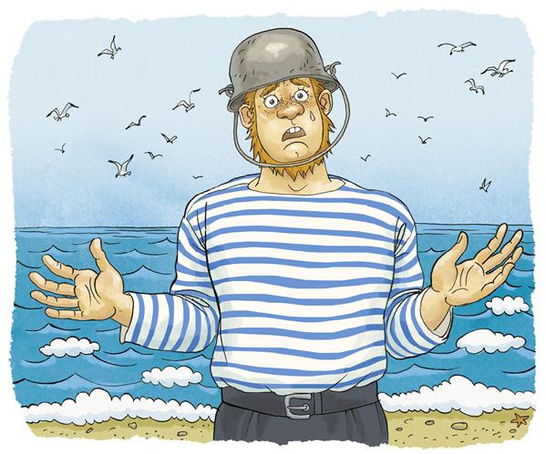 Вот тут-то у него и начались беды. Вместо МАЙНА и ВИРА он кричал: МАЙНА и ВИЛА! А однажды вместо: «Все на правый борт!» – он скомандовал: «ВСЕ НА ПЛАВАЙ БОЛТ!» Половина команды бросилась в море, а половина стала искать БОЛТ – и корабль чуть не сел на мель… Потом начались ещё бо́льшие неприятности. Новый боцман отдал повару команду: «СВАЛИТЬ УЖИН!» Кок вывалил макароны в воду, и матросы остались без ужина. В другой раз он распорядился подать капитану КАПИТАНСКИЙ КОТЕЛОК вместо катерка. Вся команда помирала со смеху. Но когда капитану вместо РОМА принесли ЛОМ, тот не на шутку разозлился и велел высадить боцмана на берег. Высадили Моляка с позором. Нахлобучили на него этот дурацкий котелок.