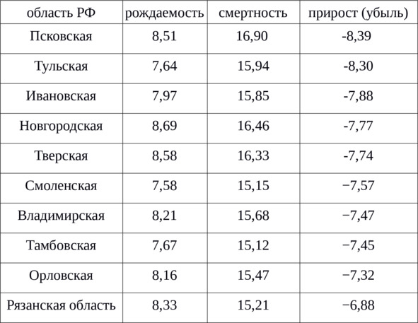 Таблица 1. Темпы вымирания русских в России по некоторым областям – у русских рождаемость в 2 раза ниже смертности [5].