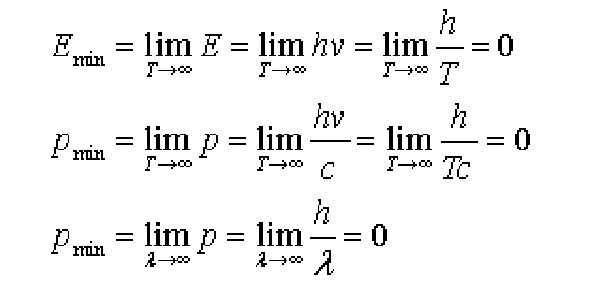 Я понимаю, что это звучит необычно, когда все знают, что есть кванты энергии и импульса. Но надо понимать, что квант – это минимальная величина энергии света определенной частоты, определенной длины волны, а для меньших частот есть и меньшие кванты и так до бесконечности. А квант излучения сколь угодно малой частоты является также сколь угодно малым (6). А поскольку в силу однородности и бесконечности пространства могут быть кванты сколь угодно большой длины волны, то и их энергия также сколь угодно мала (7).