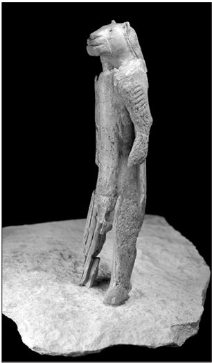 Статуэтка «человека-льва» (или «женщины-львицы») из пещеры Штадель в Германии (30 тысяч лет тому назад). Человеческое туловище увенчано головой льва. Первое неоспоримое произведение искусства и доказательство способности человеческого разума воображать вещи, которых в реальности не существует