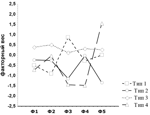 В целях построения социально-психологической типологии подчиненных были выделены типичные констелляции связей отмеченных выше критериев оценивания руководителей в разных группах респондентов. Выборка была сгруппирована в соответствии с тем, какие критерии оценки идеального руководителя для респондентов являются ведущими. С этой целью была использована процедура кластерного анализа (техника «k-средние») на основе индивидуальных факторных оценок по критериям оценивания идеального руководителя. В результате кластеризации индивидуальных факторных нагрузок компонентов структуры представлений были выделены четыре типа подчиненных, характеризующихся различным содержанием представлений о качествах идеального руководителя: 1 группа объединяет 16,8 % общей выборки респондентов, 2 группа – 24,4 %, 3 группа – 52,7 %, 4 группа – 6,1 %. Результаты кластеризации отражены в профилях факторных оценок базовых компонентов представлений каждого типа. Выделенные типы подчиненных названы нами «ориентированный на соучастие», «ориентированный на дело», «высокотребовательный», «ориентированный на профессионализм». Остановимся на их характеристике (рисунок 3).