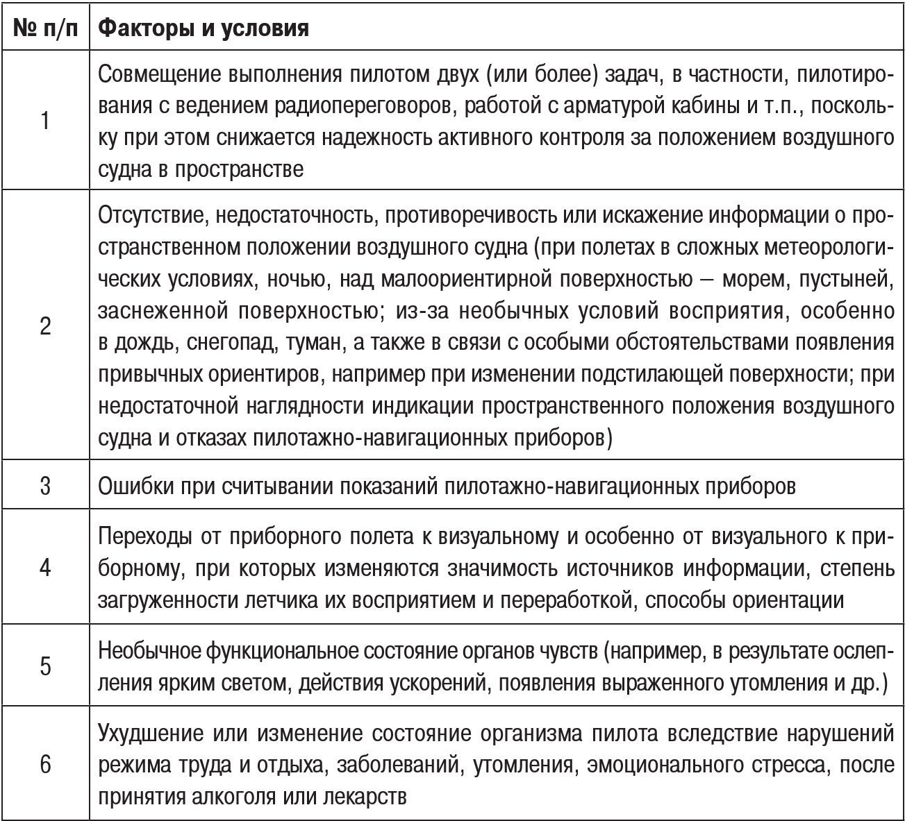 Что касается случаев частичной потери пространственной ориентировки, то при расследовании авиационных происшествий и анализе инцидентов они вообще не рассматриваются, а, как правило, отождествляются с ошибками летчика: неправильным распределением внимания, нарушением техники пилотирования, невыдерживанием дистанции, недооценкой высоты превышения над препятствием, недостаточным визуальным контролем внешней обстановки и т. д.