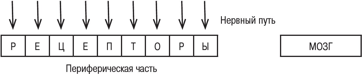 Периферическая часть анализатора – это рецепторы, специфические нервные клетки, как бы датчики или антенны, вынесенные на поверхность тела для лучшего контакта с сигналами внешней среды (некоторые рецепторы расположены во внутренних органах и системах организма). Каждый анализатор имеет свои специфические рецепторы, воспринимающие только соответствующий данному анализатору поток энергии (световой, звуковой, термической, химической и др.). Рецепторы преобразуют энергию внешнего раздражителя (сигнала) в нервные импульсы, которые передаются по нервным путям (волокнам) в ЦНС, где происходит их окончательная обработка и анализ. Но этот процесс не является дискретным. В центральной нервной системе по ходу анализа поступающей информации также вырабатываются нервные импульсы, которые направляются обратно к рецепторам для их оптимальной настройки и восприятия сигналов. Тем временем в мозгу происходит идентификация сигнала по цвету, размеру, форме, расстоянию и другим характеристикам. Собранная таким образом информация о сигнале интегрируется с информацией, находящейся в памяти, о сходном прошлом опыте и в какой‐то момент опознается характер и значение того, что мы видим и ощущаем.