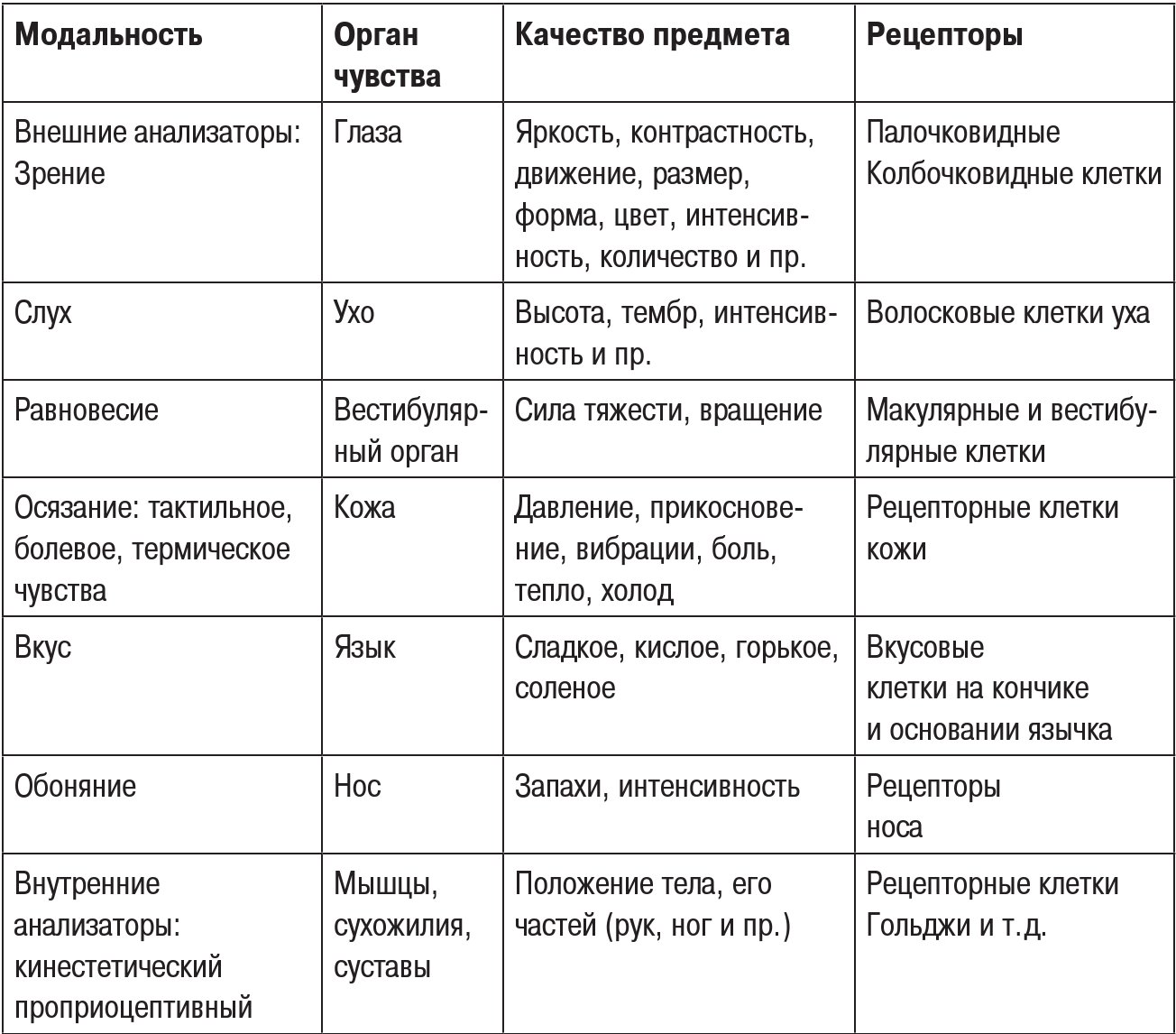 В таблице 2.1 приводятся шесть основных анализаторов (органов чувств) человека, которые воспринимают специфические для каждого из них распознаваемые ими свойства (качества) сигнала.