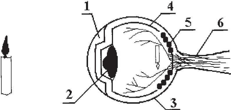 Рис. 2.2.1. Глаз в поперечном разрезе. Изображены хрусталик и поддерживающий его аппарат, радужная оболочка и сетчатка с ее рецепторами (1 – роговица; 2 – хрусталик; 3 – склера; 4 – сетчатка; 5 – фоторецепторы; 6 – зрительный нерв)