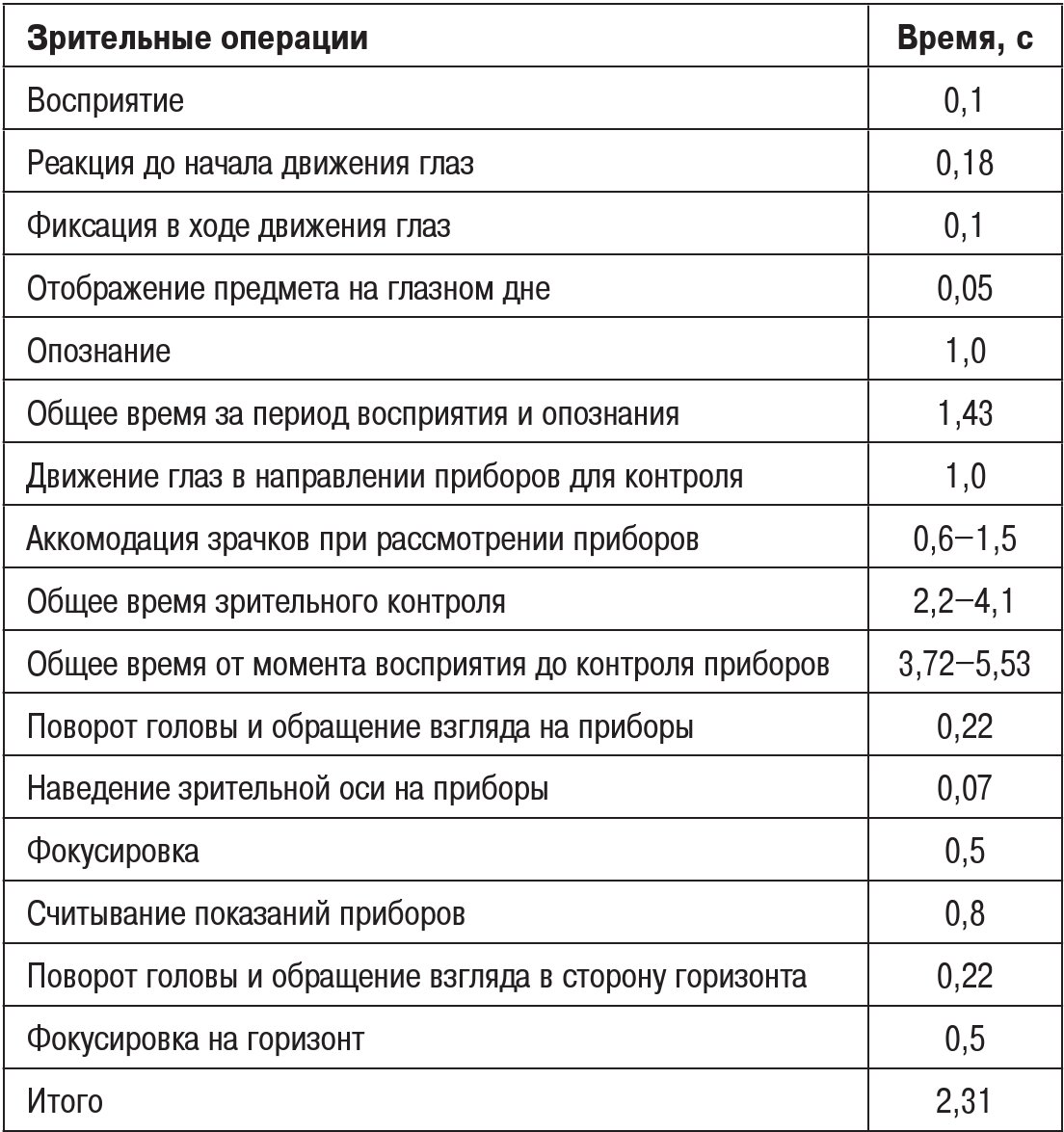 Рассчитано [28], что общее время от момента восприятия до опознания объекта составляет порядка 1,43 с, а общее время зрительного контроля – 2,3–4,1 с, в том числе движение глаз в направлении приборной доски для контроля приборов – 1,0 с (см. таблицу 2.2).