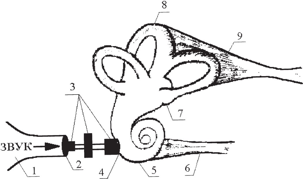 1 – слуховой проход; 2 – барабанная перепонка; 3 – слуховые косточки; 4 – овальное отверстие; 5 – улитка; 6 – слуховой нерв; 7 – отолитовый орган; 8 – полукружные каналы; 9 – вестибюлярный нерв