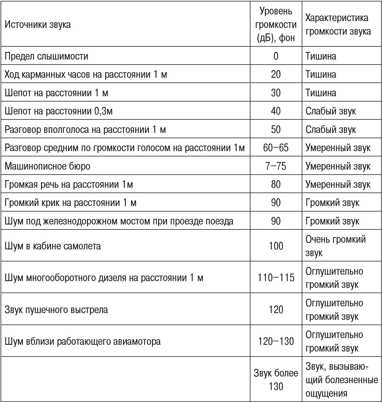 Воздействие звуковых колебаний субъективно воспринимается как громкость звука, которая зависит от интенсивности звукового давления. В качестве единицы уровня громкости звука принят фон. Это минимальное звуковое давление, которое человек может расслышать при частоте 1000 Гц. В таблице 2.3 представлены уровни громкости звука различных источников [28].