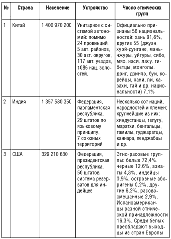 Таблица 1Государственное устройство и этнический состав крупных стран мира (на 2020 г.)
