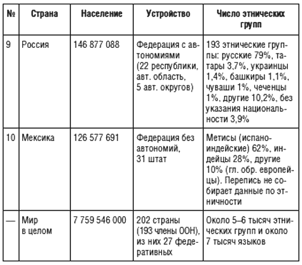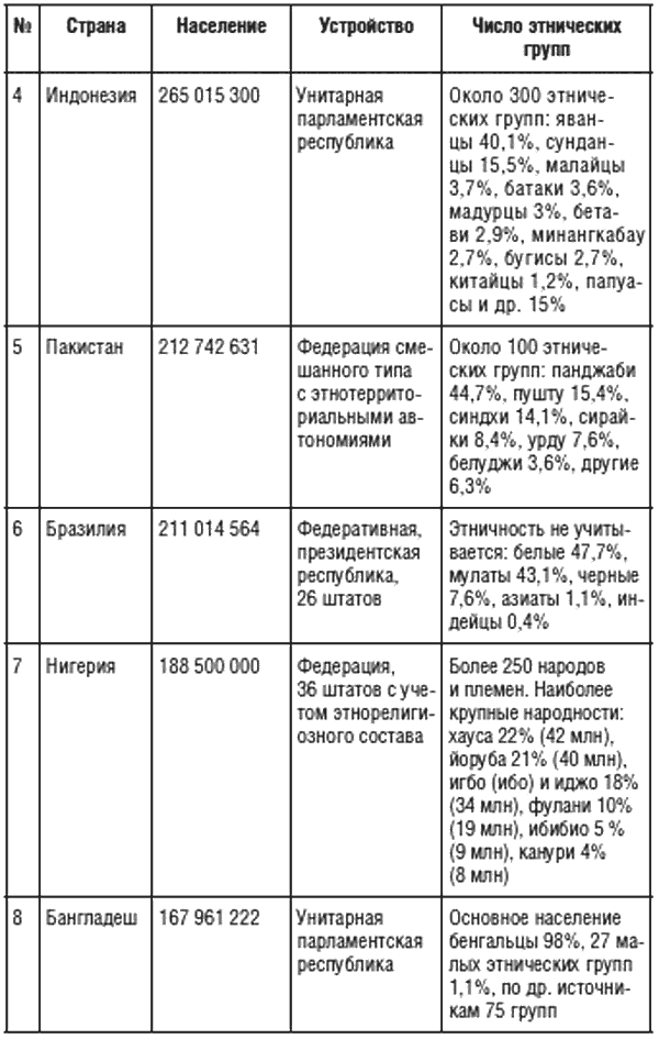 В 1960-е гг. Институт этнографии АН СССР издал многотомную серию «Народы мира», которая долгое время была наиболее авторитетным источником по данному вопросу и заслужила неофициального перевода на английский язык в США «для служебного пользования». С. И. Брук издал этнодемографический справочник о населении всех стран мира, и по каждой стране в нем содержались сведения об этноконфессиональном и расовом составе, хотя все это подводилось под концепцию повсеместного существования этносов, а не каких-либо других форм культурно-отличительных сообществ. В 1998 г. вышла в свет под моей редакцией энциклопедия «Народы и религии мира», в которой было 1250 статей о народах и 450 статей о религиях[38]. Своего рода реестр этнической номенклатуры мира ведет международная организация «Этнолог», а также свой список этнических групп мира ведет ЦРУ США. Приведем сведения по устройству и составу населения самых крупных стран мира (Таблица 1).