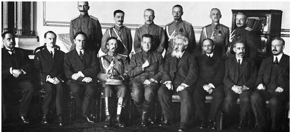 На заседании Временного правительства. Б. Савинков во втором ряду третий слева Л. Корнилов и А. Керенский в первом ряду в центре.