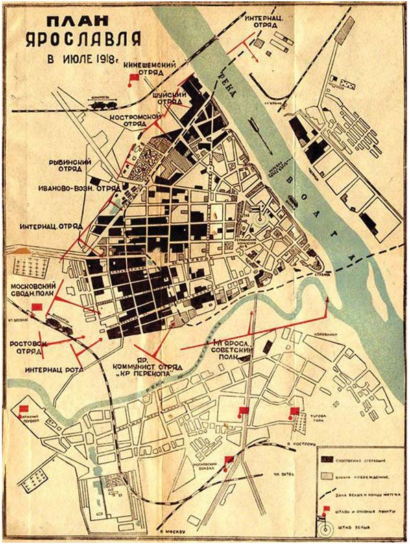 Карта-схема Ярославского восстания. Черным отмечены районы города и отдельные здания, полностью уничтоженные артиллерией. Штриховкой – дома, получившие значительные разрушения. Красными полосами и стрелками – войска Красной армии. Пунктирной линией – рубежи обороны повстанцев к моменту их капитуляции.