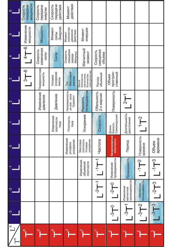 ,предложенная им совместно с П. Кузнецовым. Она состоит из вертикальных столбцов, представляющих собой целочисленные степени длины Lи горизонтальных строк – целочисленных степеней времени Т. Пересечение каждого столбца и каждой строки автоматически дает размерность той или иной физической величины. Авторы пытались максимально заполнить клеточки таблицы известными физическими величинами.