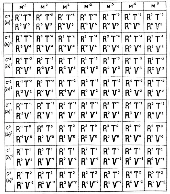 Автор, совместно с Волкевичем И. Ф. предлагают таблицу, построенную по тому же принципу, но заполненную математическими формулами. Она называется «Таблица формул для расчетов преобразований во вращательном и колебательном движениях» .
