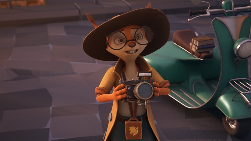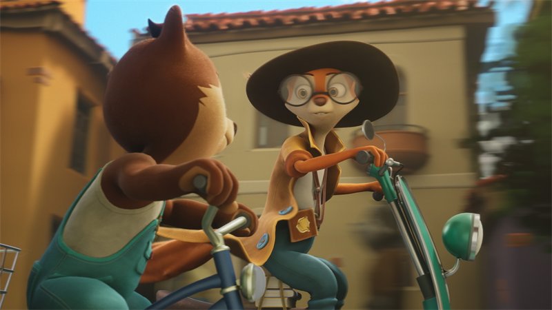 Второй только успел открыть рот, как в этот момент раздался треск и из дыры в плакате появился Чинк на мопеде. Рабочие только ахнуть успели, а бельчонок уже помчался дальше.