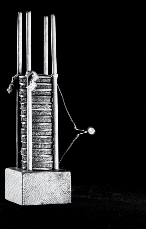 В 1800 году итальянский ученый Алессандро Вольта (1745–1827) предположил, что вещества могут являться не только проводниками, но и источниками тока, и создал первый в мире генератор: кружочки, изготовленные из двух разных металлов, складывались стопкой и переслаивались тканью или бумагой, пропитанными соленой водой либо солевым раствором. Если исследователь касался проволоки, соединявшей два конца «вольтова столба», он ощущал чувствительное покалывание. То есть химическая энергия превращалась в электрическую!