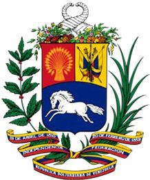 Над щитом два рога изобилия представляют богатство Венесуэлы. На лентах, которые перевязывают обрамляющие щит ветки лавра и пальмы, начертано: «19 апреля 1810 года – Независимость. 20 февраля 1859 года – Федерация. Боливарианская Республика Венесуэла».