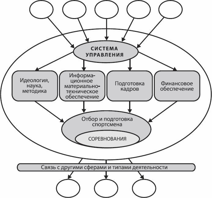 Однако спорт нельзя сводить только к соревновательной деятельности. Определяемое понятие имеет и более глубокий смысл, обусловленный социальной сущностью и назначением спорта в современном обществе. Так, по мнению С. В. Брянкина (1983), сфера спорта – это специализированная социально-организованная система, образовавшаяся вокруг соревнования и включающая в себя систему управления, идеологическое, научное, методическое, программно-нормативное, информационное, медицинское, материально-техническое и финансовое обеспечение, подготовку кадров, системы отбора и тренировки спортсменов, а также многое другое (рис. 1.1).
