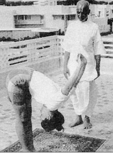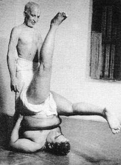 Кришнамачарья с учеником, выполняющим экапада-сарвангасану.