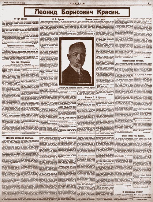 Трудящиеся массы Союза ССР, которым хорошо известно имя Л.Б. Красина, разделят горесть правительства по поводу этой тяжелой утраты»[11].