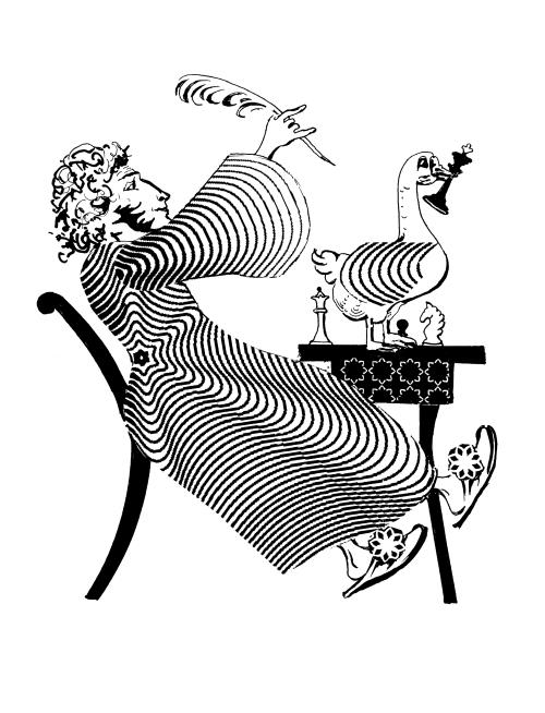 П у ш к и н (выдернув перо из белого гуся, взлетевшего на шахматный столик после того, как зерно на полу закончилось):