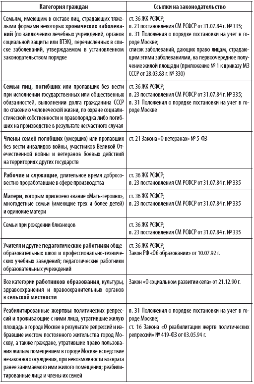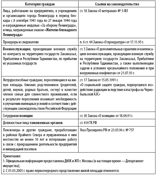 2. Первоочередники (см. таблицу 4.1.2). В большинстве жилотделов для указанной категории лиц сложилась практика предоставления жилья «через одного» от простых очередников, чтобы не ущемлять интересы последних. Поэтому «первоочередники» получают положенное быстрее, но все равно через 1–6 лет после постановки на учет (данные по Москве). Однако с введением в действие с 01.03.2005 г. нового ЖК РФ (подробнее об этом см. главу 2.1) категория «первоочередников» исчезает в принципе: эти граждане будут поставлены в обычную очередь даже не по принципу «через одного», а в соответствии с датой постановки на учет, которая для бывших «первоочередников» будет, естественно, более поздней.