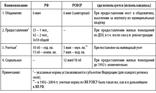 Теперь давайте подробнее разберемся с нормами площадей. В ЖК РСФСР таких существовало три (см. табл. 4.1.4), в новом ЖК РФ – осталось столько же, только они стали называться по-другому. При этом норма общежития (бывшая санитарная) установлена в ст. 105 ЖК РФ единой, учетные же нормы и нормы предоставления определяются согласно ст. 50 ЖК РФ субъектами Федерации (в табл. 4.1.4 они приведены для Москвы и Подмосковья).