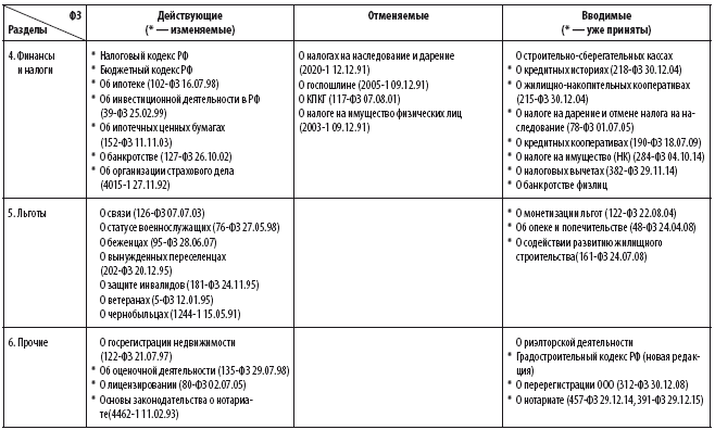Большинство законов из вышеупомянутого «пакета» весьма противоречивы. С одной стороны, они содержат ряд положений, делающих покупку жилья для граждан более доступной, а также дают больше гарантий добросовестным приобретателям недвижимости. С другой стороны, содержат ряд непопулярных мер и положений, направленных в первую очередь против малоимущих и социально незащищенных граждан, что, безусловно, является продолжением правительственной политики «минимизации льгот» в жилищной и жилищно-коммунальной сфере. В настоящий момент (начало 2016 г. – прим. ред.) на рассмотрении в Государственной Думе находятся очередные существенные изменения и дополнения к законам из «Жилищного пакета», которые вызваны практикой их применения. Скорее всего, указанные изменения будут приняты весной 2016 г. Краткие сведения об основных законах в области недвижимости приведены в таблице 2.1.