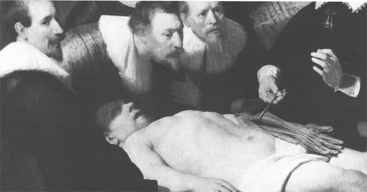 Стоя сегодня в музее Маурицхёйс перед анатомической картиной Рембрандта размером два на полтора метра, мы оказываемся на месте тех, кто в свое время наблюдал процедуру вскрытия в Палате мер и весов, и думаем, что видим то, что видели они: лежащий на переднем плане зеленоватый труп Ариса Киндта со сломанной шеей и выпирающей наружу в посмертном окоченении грудной клеткой. И все же сомнительно, что кто-нибудь и впрямь видел этот труп, ведь возникшее как раз тогда искусство вскрытия не в последнюю очередь стремилось сделать виновное тело невидимым. И что характерно: взгляды коллег доктора Тульпа направлены не на тело как таковое, но как бы чуть мимо, на раскрытый анатомический атлас, в котором жуткая телесность сведена к диаграмме, к схеме человека, как ее вообразил себе страстный анатом-любитель Рене Декарт, также присутствовавший в то январское утро в Палате мер и весов. Как известно, рассуждая о смирении перед Божественной мудростью, Декарт учил, что следует отвлечься от плоти и сосредоточиться на уже заложенной в нас машине, на том, что можно полностью понять, сделать полезным для работы и, при любых помехах, либо снова привести в движение, либо выбросить вон. Странной отторженности тела, как-никак выставленного на всеобщее обозрение, соответствует и то, что хваленая достоверность Рембрандтовой картины при ближайшем рассмотрении оказывается мнимой. Вопреки традиции изображенная здесь процедура начинается не с вскрытия живота и удаления кишечника, быстрее всего подвергающегося разложению, но с рассечения преступной руки (что также указывает, вероятно, на акт возмездия). И рука эта опять-таки своеобразна. Она не только гротескно непропорциональна по сравнению с рукой, ближней к зрителю, но совершенно искажена анатомически. Обнаженные сухожилия, которые, судя по положению большого пальца, располагаются на левой ладони, на самом деле – сухожилия тыльной стороны правой руки. Значит, речь идет о чисто технической накладке, о детали, попросту взятой из анатомического атласа, но из-за нее картина, написанная, так сказать, с натуры, именно в своем смысловом центре, там, где разрезы уже сделаны, оборачивается вопиюще неудачной конструкцией. То, что Рембрандт здесь как-то оплошал, вряд ли возможно. Мне, скорее, кажется, что он умышленно нарушил композицию. Изуродованная рука – знак насилия, совершенного над Арисом Киндтом. Художник отождествляет себя с ним, с жертвой, а не с гильдией, сделавшей ему заказ. У него одного нет застывшего картезианского взгляда, только он видит это угасшее, зеленоватое тело, видит тень на полуоткрытых губах и над глазом мертвеца.