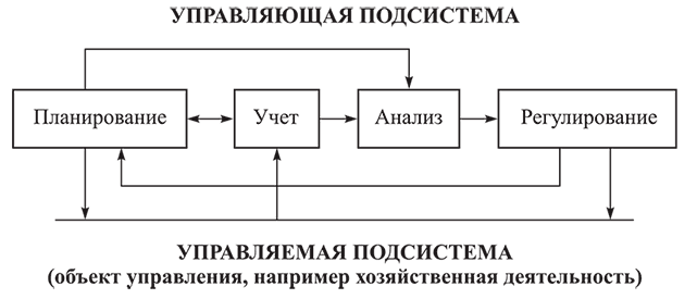 Чтобы активно воздействовать на управляемую подсистему (объект управления), необходимо в управляющей подсистеме иметь четкую технологию принятия управленческих решений. Эта технология состоит из четырех основных взаимосвязанных управляющих функций: планирования, учета, анализа, регулирования. Их место в системе управления показано на рис. 1.