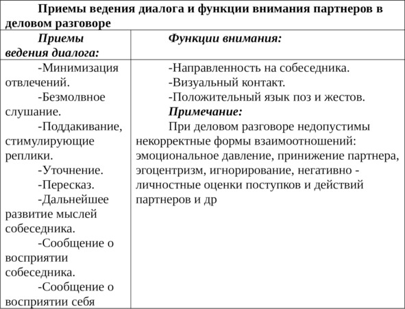 В разговорной речи при ведении делового разговора могут использованы различные приемы ведения диалога, но при этом следует следить за функциями своего внимания (табл.2.1)