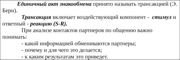 Для этих целей следует использовать трансактный подход ((Э. Берн). Основой общения является установление и поддержание контактов между людьми. Контактирование рассматривается как любой речевой или неречевой знакообмен между партнерами по общению, который оказывает влияние на их поведение. Единицей контакта, а следовательно, и общения, является обмен коммуникантами, т.е. обмен «знак на знак» (S=R) от партнера к партнеру.