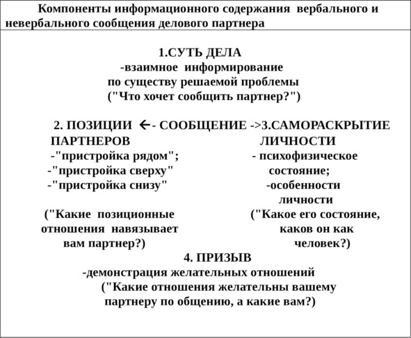 – о существе дела: истинных и скрытых намерениях lделовых партнеров («Что хочет сообщить партнер?»);