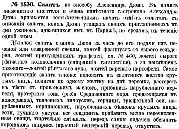 Вряд ли есть человек, не увлекающийся книгами Александра Дюма (отца), не следовавший за судьбами трех мушкетеров, храброго Д. Артаньяна, королевы Марго, графа Монте-Кристо. «Но мало кто знает, что почти в любой кулинарной книге конца прошлого можно найти супы, салаты и сладкие блюда или названные в честь прославленного романиста или приготовленные по его рецептам. Александр Дюма очень серьезно увлекался кулинарией и написал, и издал несколько кулинарных книг в том числе его знаменитый кулинарный словарь, объемом в несколько сотен страниц.» Словарь был впервые издан в 1870 году. На русском языке в полном объеме Большой кулинарный словарь Александра Дюма был издан в 2006 году издательством Олимпия пресс. 13