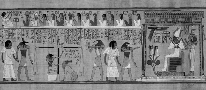 Рис. 1. Слева изображено, как бог Анубис (с телом человека и головой шакала) ведёт почившего на суд, означенный весами, затем подсудимый предстаёт со своим оправдательным словом перед Осирисом. Композиция суда отдалённо напоминает христианскую иконографию, но о непосредственном заимствовании судить сложно: хотя о «Книге мёртвых» и было известно в Средневековье, её содержание смогли дешифровать только в XIX–XX вв. Папирус Хунефера, 1310–1275 гг. до н. э. Лондон. Британский музей. ЕА 9901.