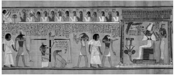 Мифы Древнего Египта также рассказывают об уничтожении и возрождении человеческого рода. Но уникальными памятниками этой культуры стали «Тексты пирамид» (Древнее царство – XXIV–XXII вв. до н. э.), «Тексты саркофагов» (Среднее царство – XXI–XVII вв. до н. э.) и «Книга мёртвых» (Новое царство – XVI–XII вв. до н. э.), повествующие не о всеобщей, а об индивидуальной смерти. Изначально заупокойные тексты, которые должны были обеспечить царю благодатную жизнь за дверью гроба, читались вслух, потом стали переноситься на саркофаги придворных и вельмож и, наконец, на папирусы, украшенные рисунками с изображением сцен погребения, заупокойным ритуалом, посмертным судом. Так появилась «Книга мёртвых» – сложносоставной религиозно-магический сборник, формировавшийся в течение веков. Сакральные тексты, где этическое учение переплеталось с древней магией, включали различные произведения, связанные с загробным культом. В знаменитой 125-й главе «Книги» описывается посмертный суд Осириса над умершими, перешедший в изображение на стенах гробниц, а затем – на саркофагах, и постепенно ставший сюжетом древнеегипетского иконографического канона. Коронованный Осирис, царь и судья потустороннего мира, изображался сидящим на троне, с жезлом и плетью в руках – знаками царской власти. Над ним восседали боги. В центре зала суда стоят весы, на которых боги Тот и Анубис взвешивают сердце – символ души покойного. В 30-й главе покойник просит своё сердце не свидетельствовать на суде против себя же. Итак, на одной чаше весов находится сердце (душа, совесть) – лёгкое или обременённое грехами, а на другой – истина в виде пера богини Маат или её фигурки. Если человек вёл на земле праведный образ жизни, то его сердце и перо весят одинаково, если грешил, то сердце перевешивало. Оправданного покойного отправляли в загробный рай, грешника поедало чудовище Амат (существо с головой крокодила и совмещающее черты льва и гиппопотама). Подсудимый говорил длинную оправдательную речь своим судьям и своеобразным присяжным: «Вот я пришёл к тебе, владыка правды; я принёс правду, я отогнал ложь. Я не творил несправедливого относительно людей. Я не делал зла. Не делал того, что для богов мерзость. Я не убивал. Не уменьшал хлебов в храмах, не убавлял пищи богов, не исторгал заупокойных даров у покойников. Я не уменьшал меры зерна, не убавлял меры длины, не нарушал меры полей, не увеличивал весовых гирь, не подделывал стрелки весов. Я чист…»5 (см. рис. 1).