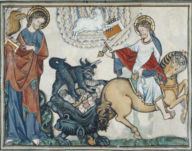 Рис. 8. Второе животное (телец) даёт послание «взять мир», и на рыжем (красном) коне выезжает всадник, облачённый в доспехи, кольчугу. Он несёт войну и раздор: люди побивают друг друга. Апокалипсис с комментариями Беренгадуса. Англия, 1320–1330. London. British Library. Add MS 17333, fol. 6r.