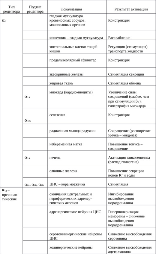 Локализация и результат активации α-адренорецепторов представлена в таблице 2.
