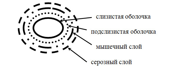 Желудочно-кишечный тракт (ЖКТ), или так называемый пищеварительный тракт, начинается ротовой полостью (ртом) и заканчивается анальным отверстием. По своему строению он представляет собой длинную трубку, которая имеет различный диаметр на отдельных участках, с большим количеством изгибов и с несколькими сфинктерами. Отдельные части ЖКТ выделяются анатомически, а также по функциональным особенностям, например три отдела тонкого кишечника. Начиная с пищевода, все отделы пищеварительного тракта имеют принципиально одинаковое строение. Собственно стенка пищеварительной трубки состоит из следующих слоев – слизистая и подслизистая оболочка, мышечный и серозный слой (схема 1).