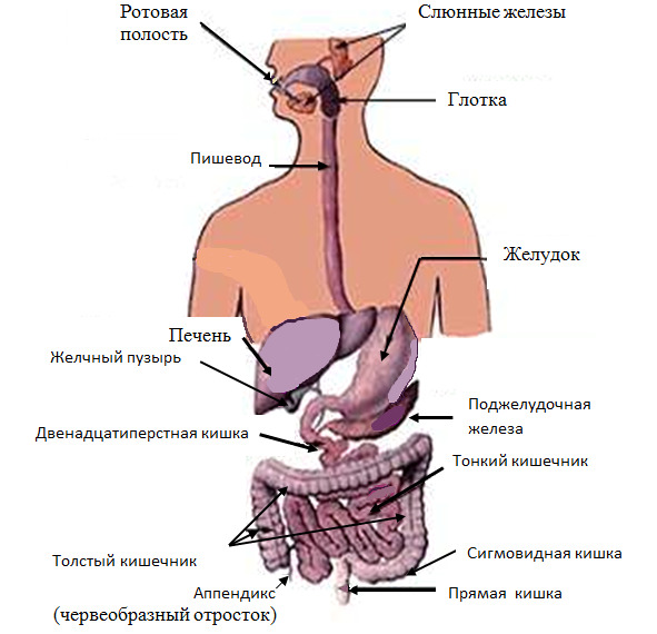 Рисунок 3. Схематическое изображение желудочно-кишечного тракта и органов, участвующих в пищеварении