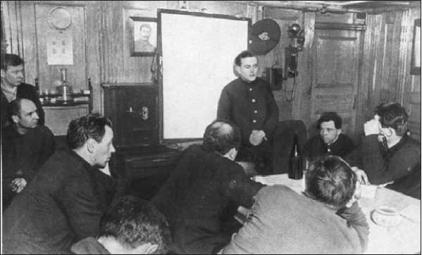 П.П. Ширшов делает первый доклад на борту ледокольного парохода «Таймыр» о работе станции «СП-1». Фотооткрытка.