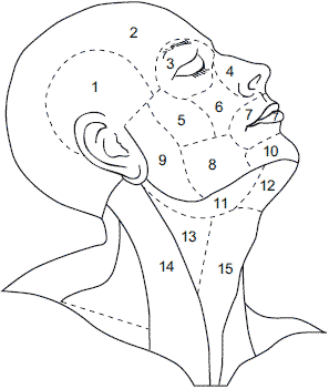 Рис. 1. Области головы и переднего отдела шеи, наиболее важные для хирургической стоматологии и челюстно-лицевой хирургии. 1 – височная область, 2 – передний отдел лобно-теменно-затылочной области, 3 – область глазницы, 4 – область носа, 5 – скуловая область, 6 – подглазничная область, 7 – область рта, 8 – щечная область, 9 – околоушно-жевательная область, 10 – подбородочная область, 11 – поднижнечелюстная область, 12 – подподбородочная область, 13 – сонный треугольник, 14 – грудино-ключично-сосцевидная область, 15 – лопаточно-трахеальный треугольник (по: Шаргородский А. Г., 1976).