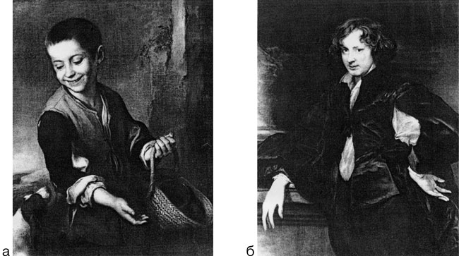 Рис. 2. Изменения рельефа лица в норме при различном состоянии мышц лица (мимических мышц). а – мальчик с собакой (Мурильо, 1650), б – автопортрет (Ван Дейк, 1630).