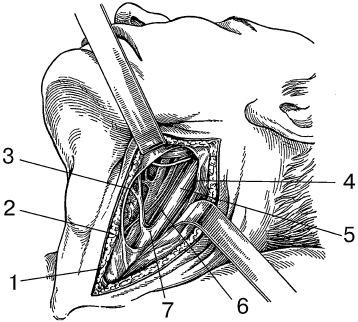 Рис. 5. Слои, определяемые в линейной ране при обнажении наружной сонной артерии:! – кожа; 2 – подкожная жировая клетчатка; 3 – подкожная мышца шеи; 4 – грудино-ключично-сосцевидная мышца; 5 – внутренняя яремная вена; 6 – блуждающий нерв; 7 – наружная сонная артерия (по: Лопухин Ю. М., Молоденков М. Н., 1968).