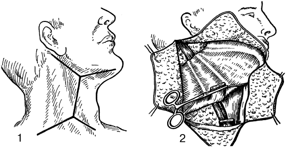 Рис. 6. Стратиграфическая последовательность действий при выполнении шейной лимфаденэктомии (операции Крайля) лоскутным способом: 1 – направления разрезов кожи перед выкраиванием лоскутов; 2 – рассечение поверхностной фасции и подкожной мышцы шеи над верхним краем ключицы от грудины до трапециевидной мышцы. Обнажение ножек грудино-ключично-сосцевидной мышцы. Выделение клетчатки бокового треугольника шеи. Пересечение ножек грудино-ключично-сосцевидной мышцы (по: Пачес А.И., 1987).