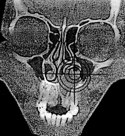 Рис. 8. Определение координат кисты центрального отдела верхней челюсти (срез на уровне премоляров) на компьютерной томограмме (по: Соловьев М. М., Семенов Г. М., Галецкий Д. В., 2004).